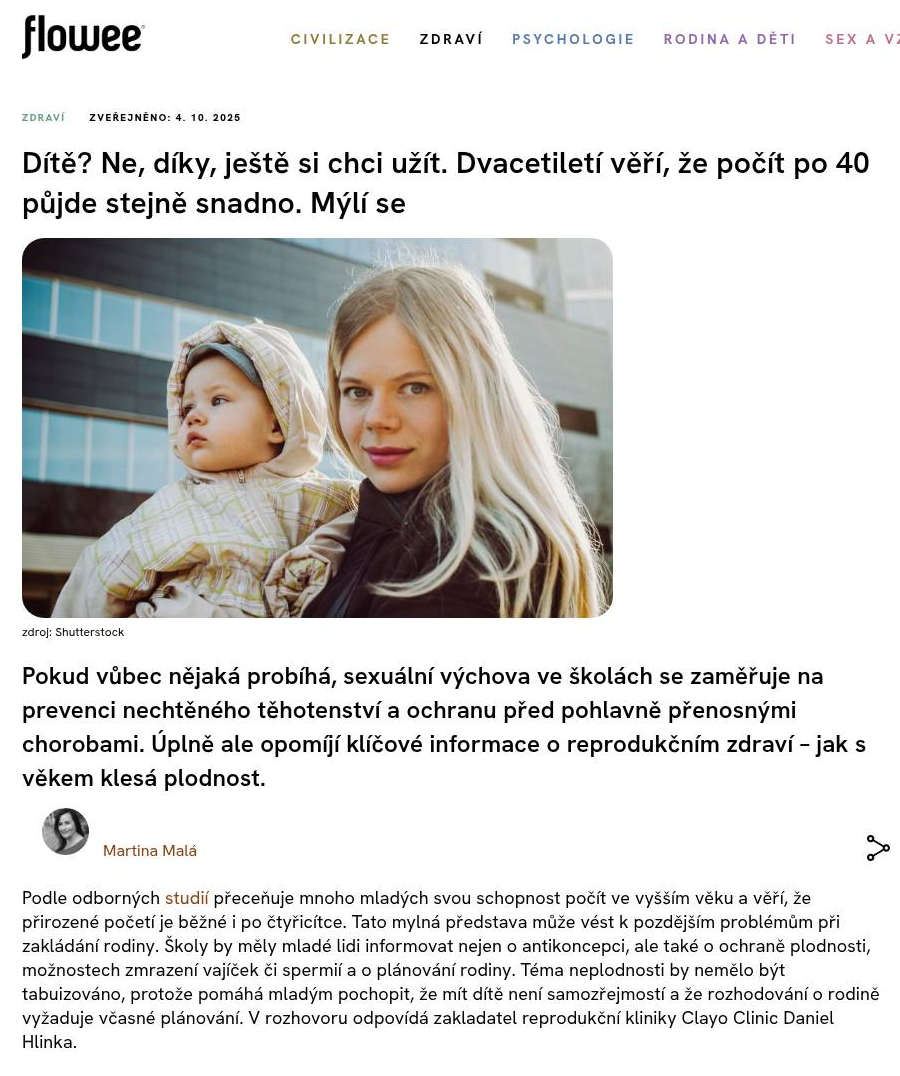 PR komunikace launche nové kliniky asistované reprodukce se opírala o několik hlavních témat. Jedním z nich bylo zdůraznění skutečnosti, že za centrem stojí špičkový česko-slovenský embryolog. Oslovili jsme média s nabídkou rozhovoru se zakladatelem kliniky Danielem Hlinkou a komunikovali jsme nejen jeho zkušenosti a nové metody léčby, které zavedl do praxe, ale také jeho osobní příběh, jelikož má s asistovanou reprodukcí vlastní zkušenost. Soustředili jsme se především na mainstreamová a lifestylová média zaměřená na ženy.